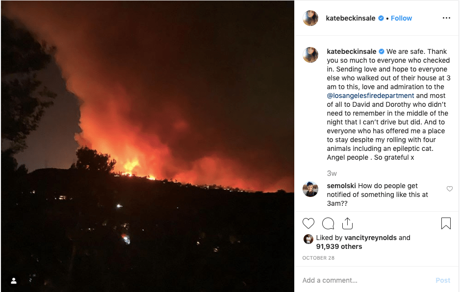 Celebrities such as Miley Cyrus and Kate Beckinsale took to social media to share their emotional experiences living nearby of the wildfires. Cyrus shared images of her burnt down property, emphasizing the importance of family and friends in situations like these. By sharing this story with her millions of followers, Cyrus is sharing how people can be impacted by the severity of environmental situations such as this one. Kate Beckinsale, another celebrity, also took to Instagram to share with her followers the experience of having to evacuate her property at 3 a.m., “We are safe. Thank you so much to everyone who checked in. Sending love and hope to everyone else who walked out of their house at 3 am to this, love and admiration to the @losangelesfiredepartment and most of all to David and Dorothy who didn’t need to remember in the middle of the night that I can’t drive but did. And to everyone who has offered me a place to stay despite my rolling with four animals including an epileptic cat. Angel people. So grateful x”. This example shows a positive outlook on the celebrity’s use of the platforms to educate and bring awareness to the issue.
